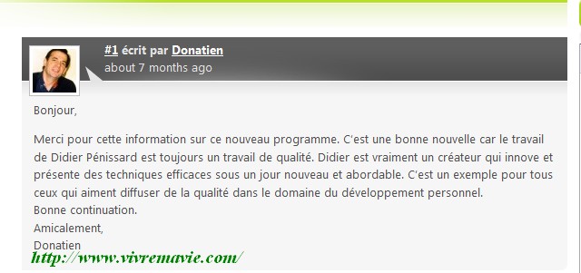 "...Je suis entrain de prendre vos cours et les met en pratique chaque jour j'en suis au 6 ème cours et c'est très interessant loin des bouquins que j'ai lu jusqu'à présent qui ne m'ont rien apporté. Déjà à la 3 ème nuit il s'est passé des choses (sauf à la 4è nuit) A partir du 2 ème cours je me suis mis à la pratique".Laurent S